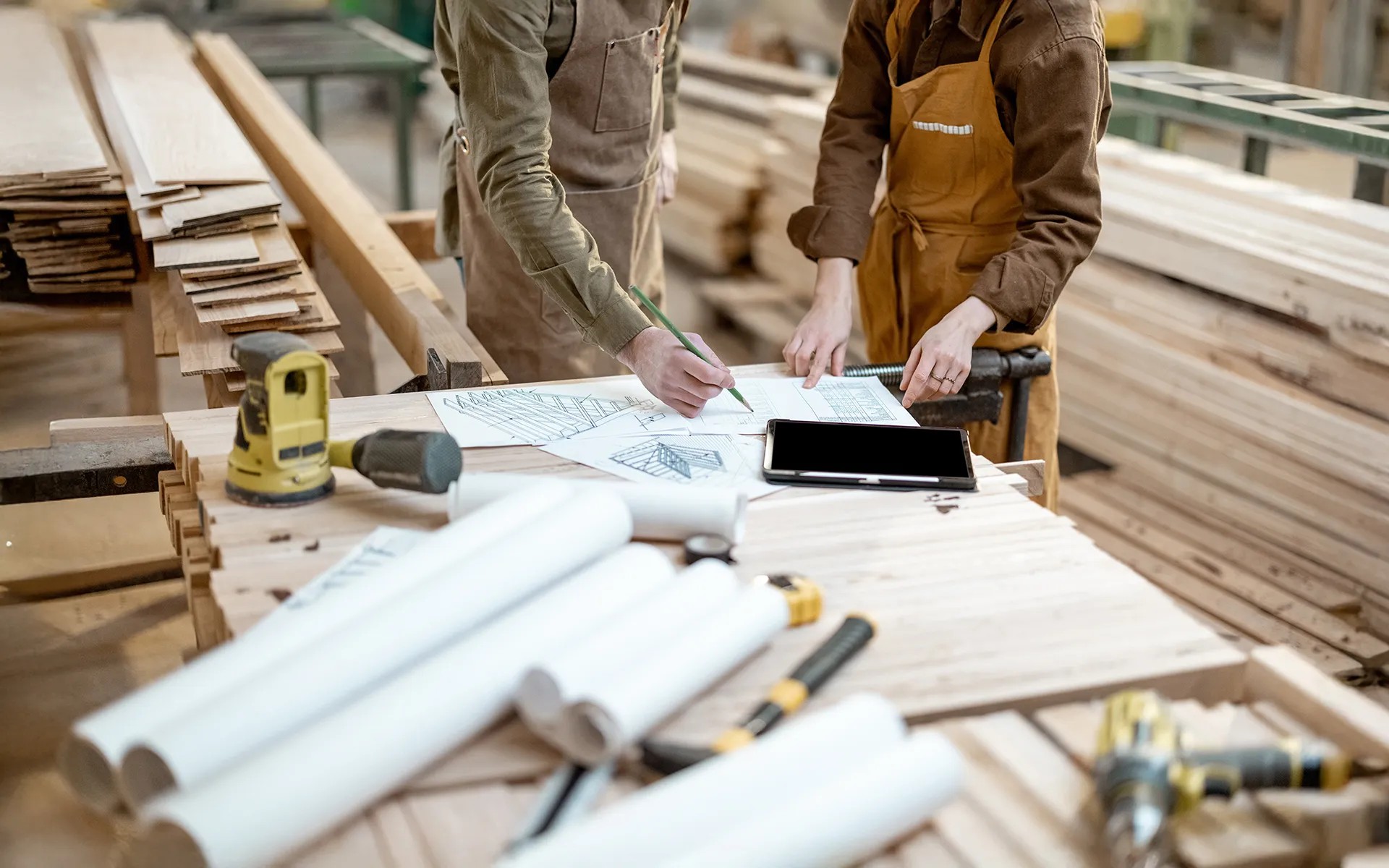Nos compagnons qualifiés interviennent sur une grande variété de projets. Pour les menuiseries extérieures, nous fabriquons et posons des fenêtres sur mesure, des portes d'entrée bois, alu et PVC, des volets bois battants ou coulissants et des baies vitrées adaptées à toutes les configurations de façade. Pour l'aménagement intérieur, nous réalisons des cuisines sur mesure, des meubles de salle de bain, des bibliothèques, des dressings, des placards intégrés et tout type de mobilier bois pensé pour optimiser votre espace. Nos équipes fabriquent également des escaliers bois sur mesure, des garde-corps et des portes intérieures, ainsi que des agencements professionnels pour magasins, boutiques et locaux tertiaires.